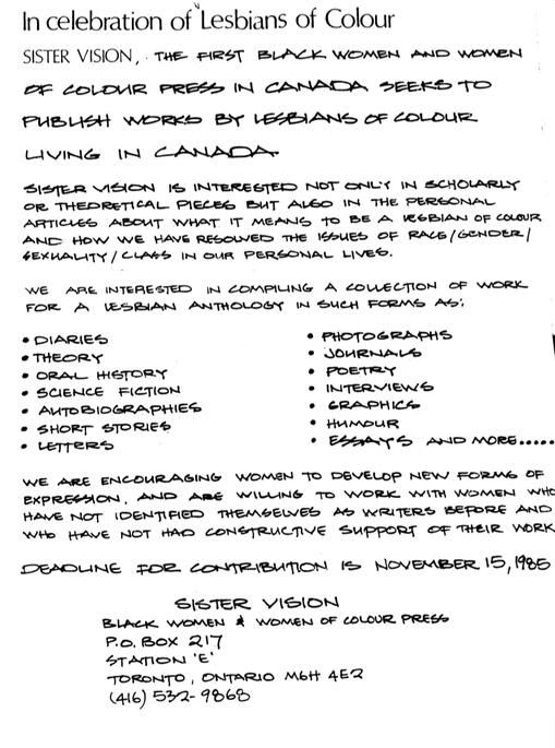 Sister Vision Press was co-founded by Makeda Silvera and Stephanie Martin. In describing the significance of the name Silvera notes: “We looked close to home for a name, in other words, at who we were—two sistas—two feminists with a vision. And so, the Press was named Sister Vision” (2022, 327). The founding of Sister Vision was a radical intervention in Canadian publishing.Writings by and about Black women, Indigenous women and women of colour were significantly underrepresented and there existed numerous institutional roadblocks to publishing these works. Sister Vision would also become an important space for publishing lesbian and queer writing. It offered a nexus for works articulating intersectional social concerns.